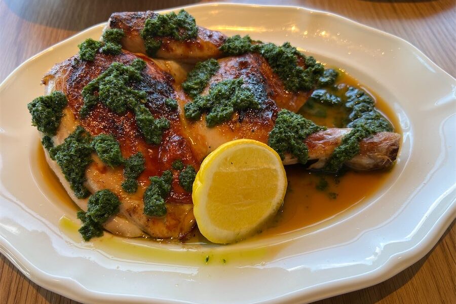 Mains were impressive. The pasture-raised half chicken was created with beer brine and cooked in Lunetta Trattoria’s large wood-fired oven. It was super moist, loaded with deliciousness and arrived with a rich, full-bodied jus, dollops of fresh, vibrant watercress verde, and a juicy half lemon ($28).