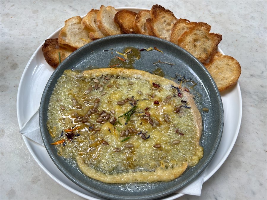 Sharing is the name of the game, and we delighted in the broad bean hummus, well balanced and a lovely texture. It arrived with Turkish bread and crispy polenta. We applauded the sumac.